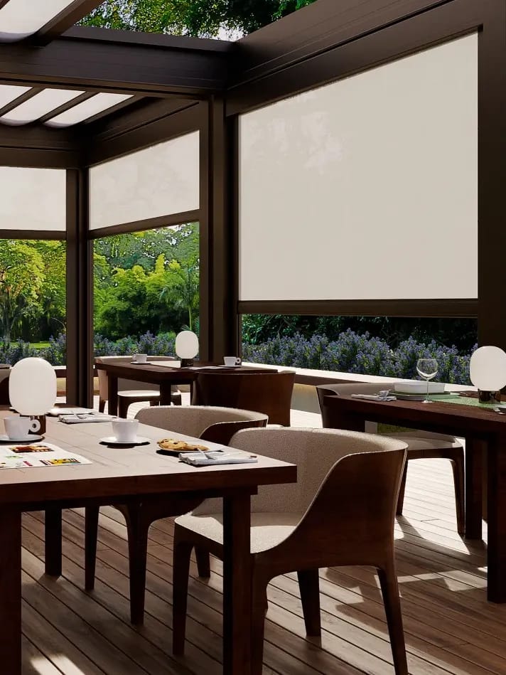 ideias para ambientes externos e com acionamento manual ou motorizado, podem ser utilizados em pequenas ou grandes dimensões, eficazmente contra chuva, vento e poeira.